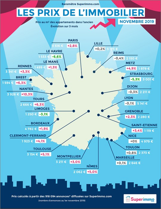 En novembre les prix stagnent pour Nice et Lyon. L'ouest est toujours très représenté dans les hausses.